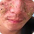 3、可见急性水肿、淤斑或水泡,同时有一定刺痛症状,严重时眼睑及颜面肿胀,呈现紫红色。