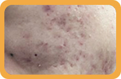 痘印、痘坑明显,面容红肿